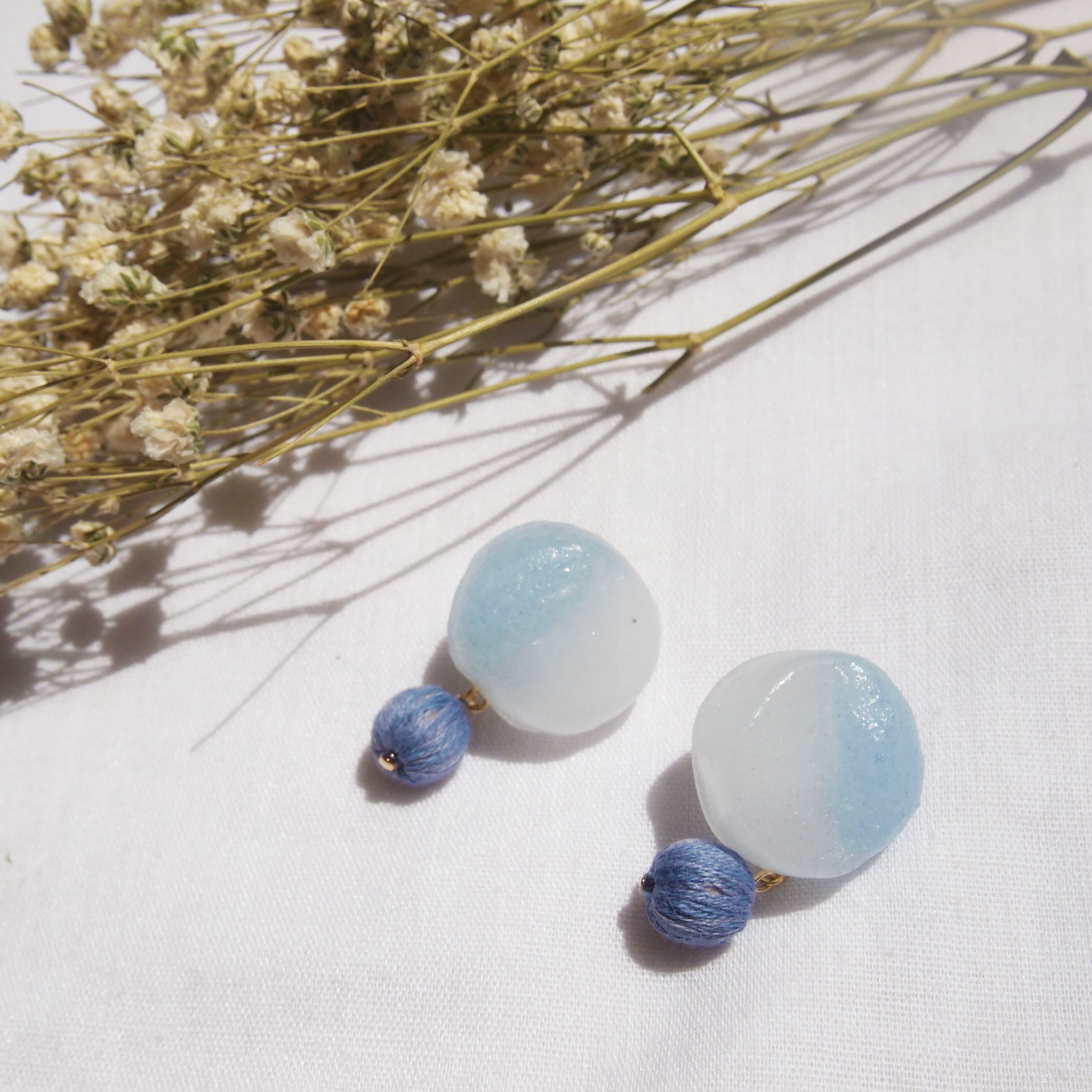 パート・ド・ヴェールの技法でつくった、少し大きめの水色と白のグラデーションのガラスに