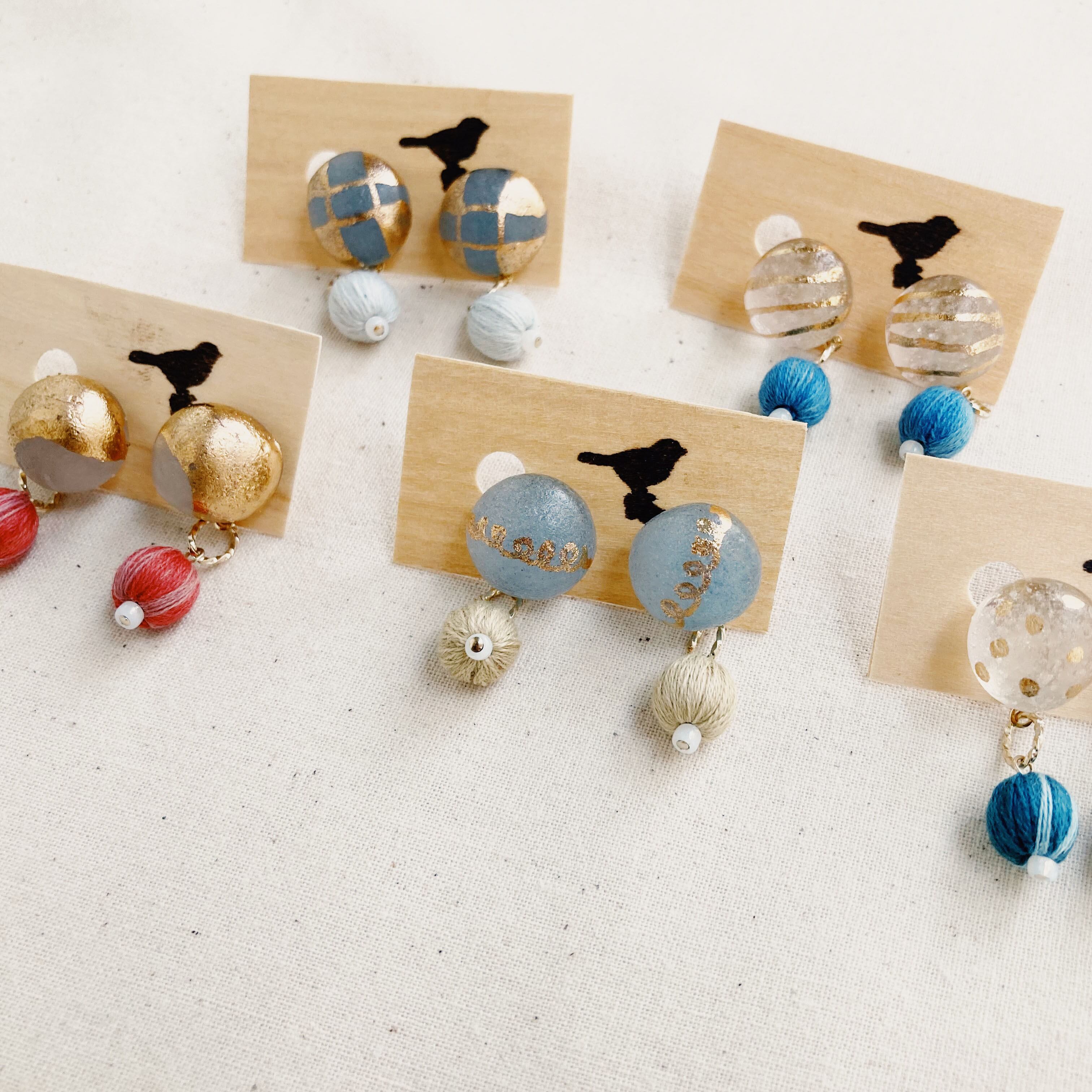 ピアス金具、ガラス、ウッドビーズ、ガラスビーズ、糸