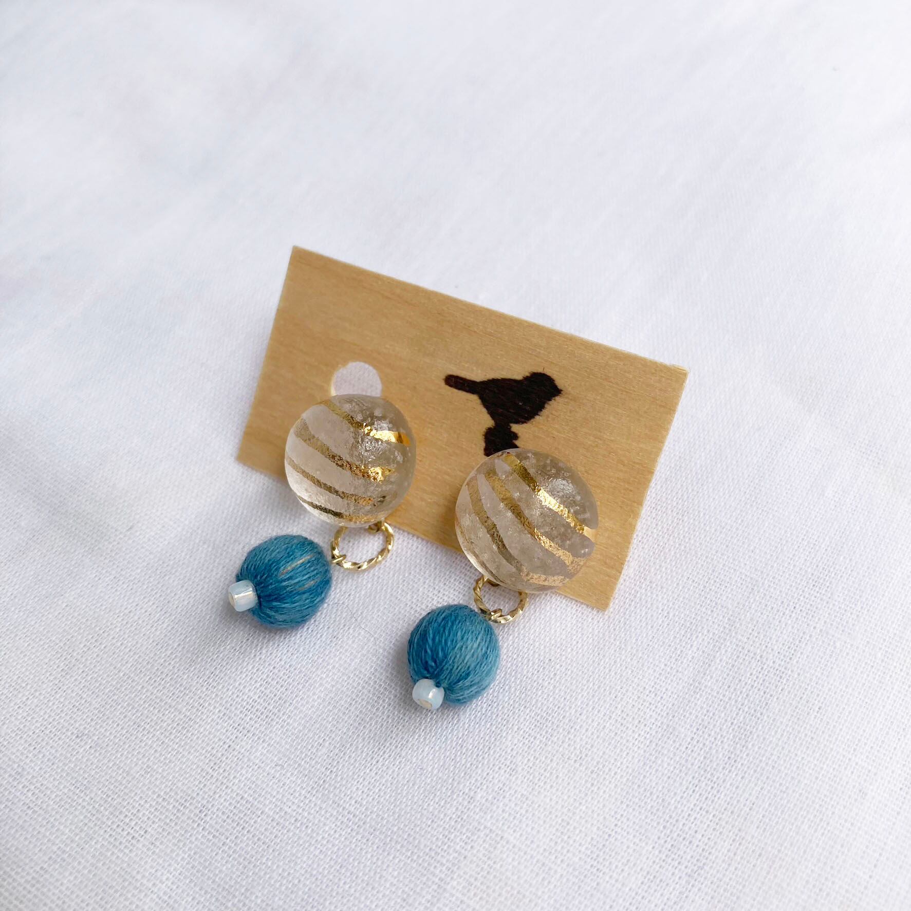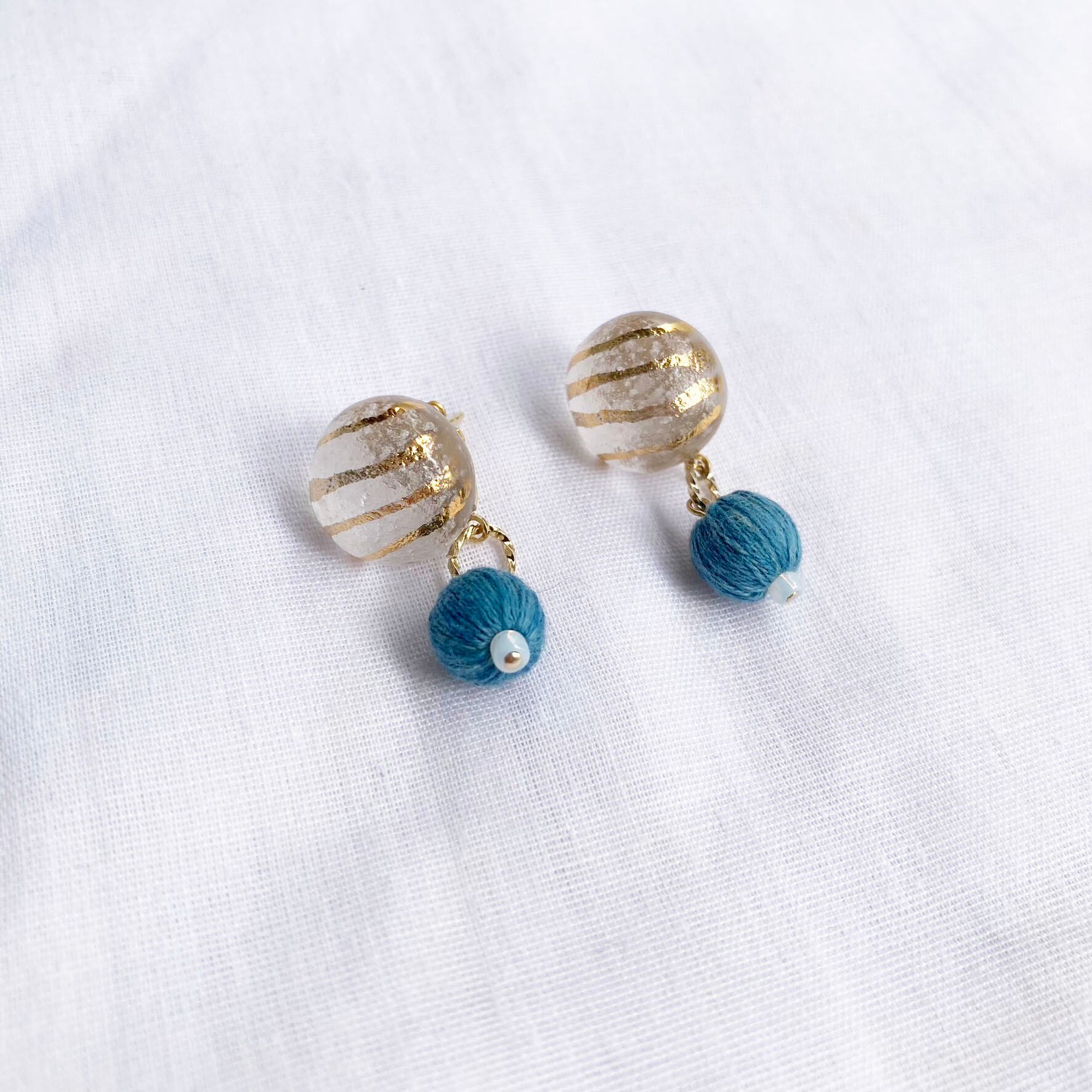 ガラスと糸玉のピアス(ボーダー/青緑)